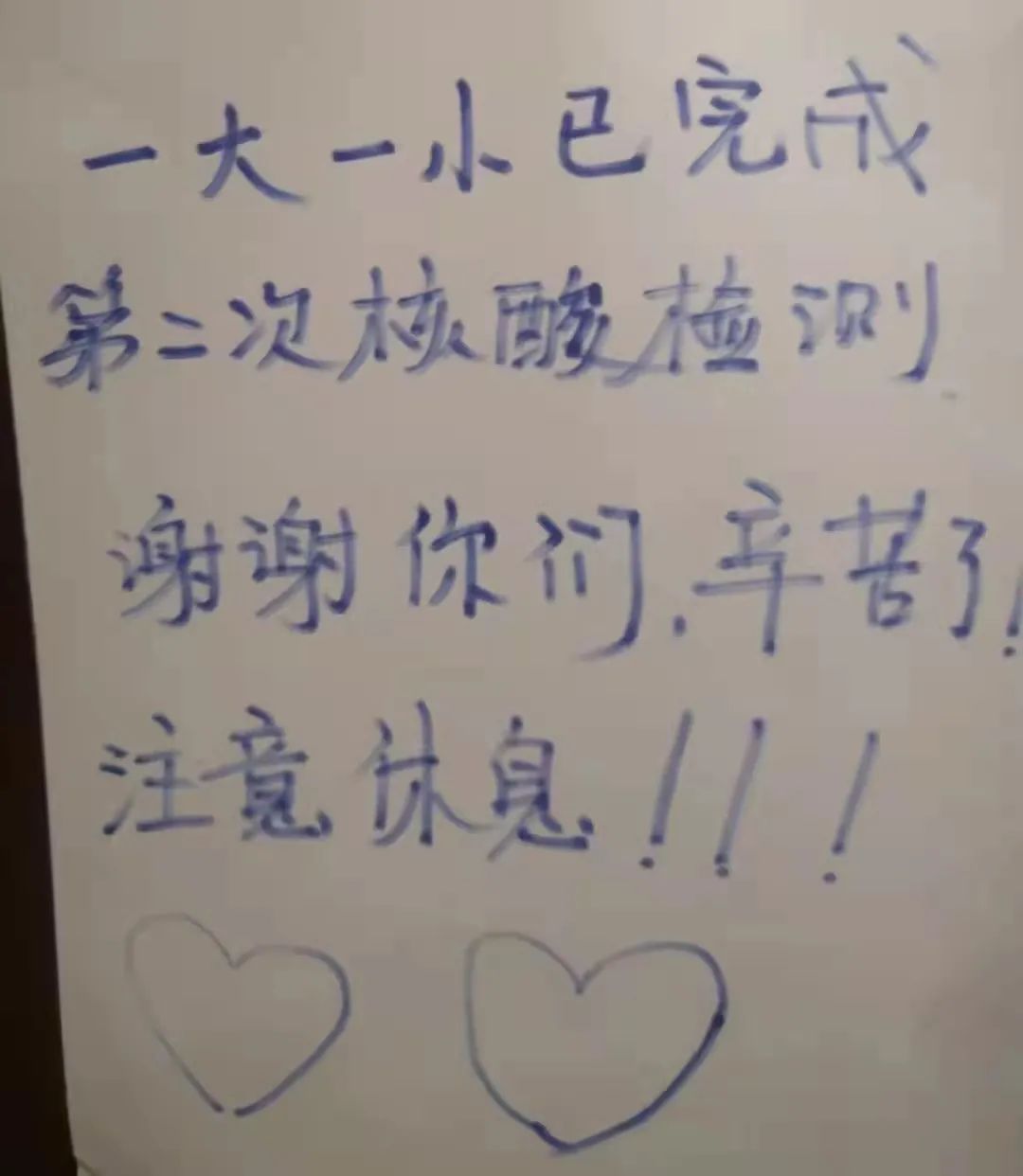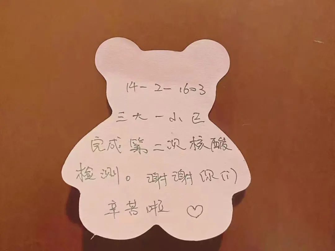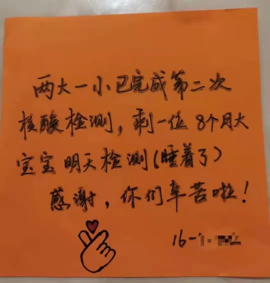 胡女士看到后,也找来便利贴和水笔,让老公写了一张,写的是“一大一小已完成第二次核酸检测,谢谢你们,辛苦了。注意休息”,还画上了两个大大的爱心。