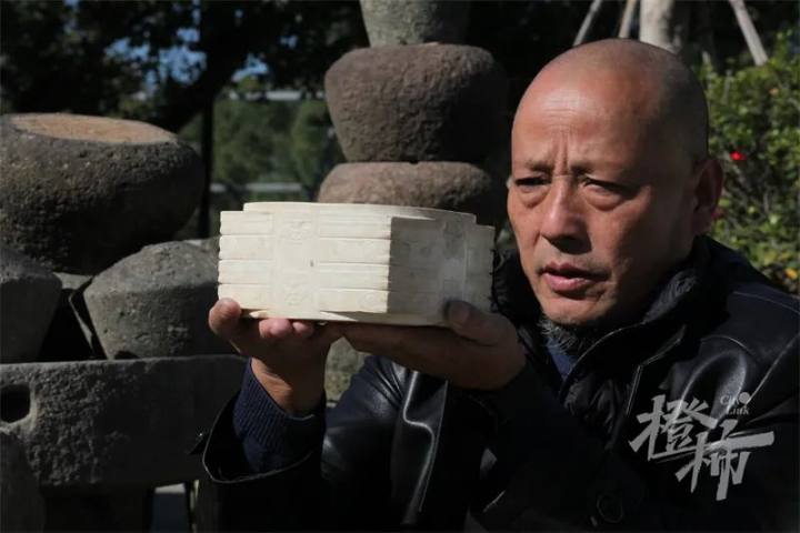 杭州工匠赵阿玉手捧玉琮王复制品。记者 程潇龙 摄