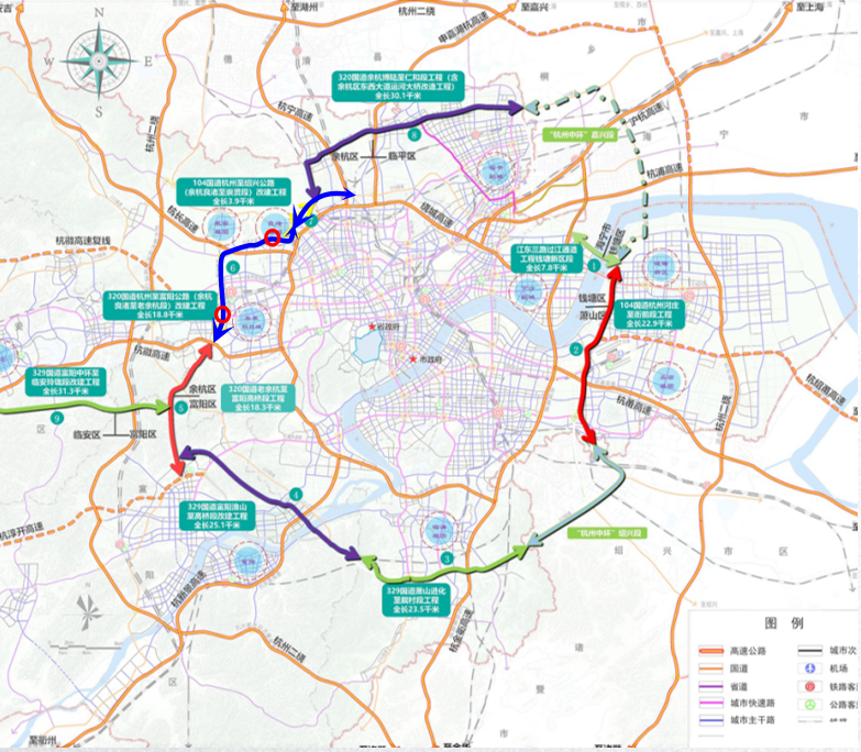 320国道杭州博陆至仁和段工程(余杭段)工程全线设互通式立体交叉7处,路线全长约12.9km,目前建议书报批中,计划于2022年底开工,2025年完工。