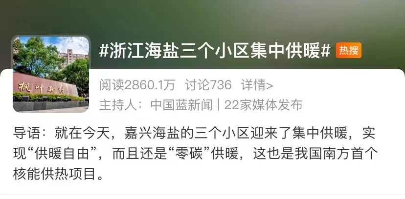 今天上午,“浙江海盐三个小区集中核能供暖”的消息冲上了微博热搜。