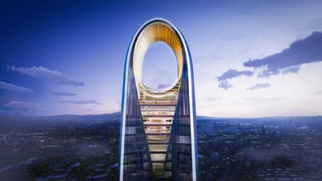 塔冠之上设计了点睛观景平台——拱形的云眼会客厅,在不同灯光的照射下将呈现迥异的效果,犹如一件大尺度艺术品,点亮城市夜空。