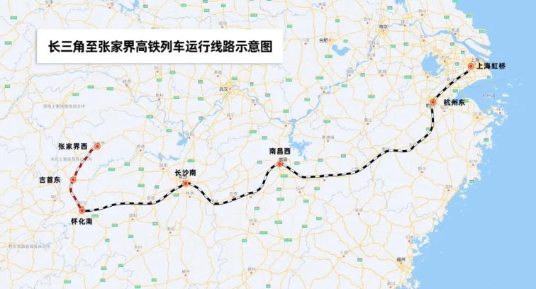这是长三角地区至张家界开行的首对高铁列车,相比原来的K字头列车,两地旅行时间压缩一半以上,极大方便沿线群众出行。