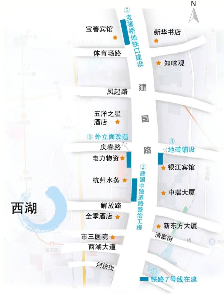 5号线基本完成后,路面建设就交付给了属地,路面工程由属地住建部门负责。建国中路(庆春路-解放路)道路整治工程属湖滨指挥部负责,相关负责人说,该工程长约850米,施工单位为杭州市城市建设基础工程有限公司,今年6月正式实施道路恢复,预计2022年3月整体竣工通车,目前已基本恢复道路中心线以东路面,实施西侧道路管线迁改及路基施工。