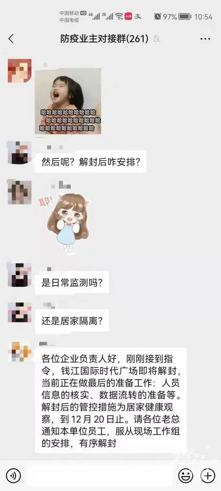 各位企业负责人好,刚刚接到指令,钱江国际时代广场即将解封,当前正在做最后的准备工作:人员信息的核实、数据流转的准备等。解封后的管控措施为居家健康观察,到12月20日止。