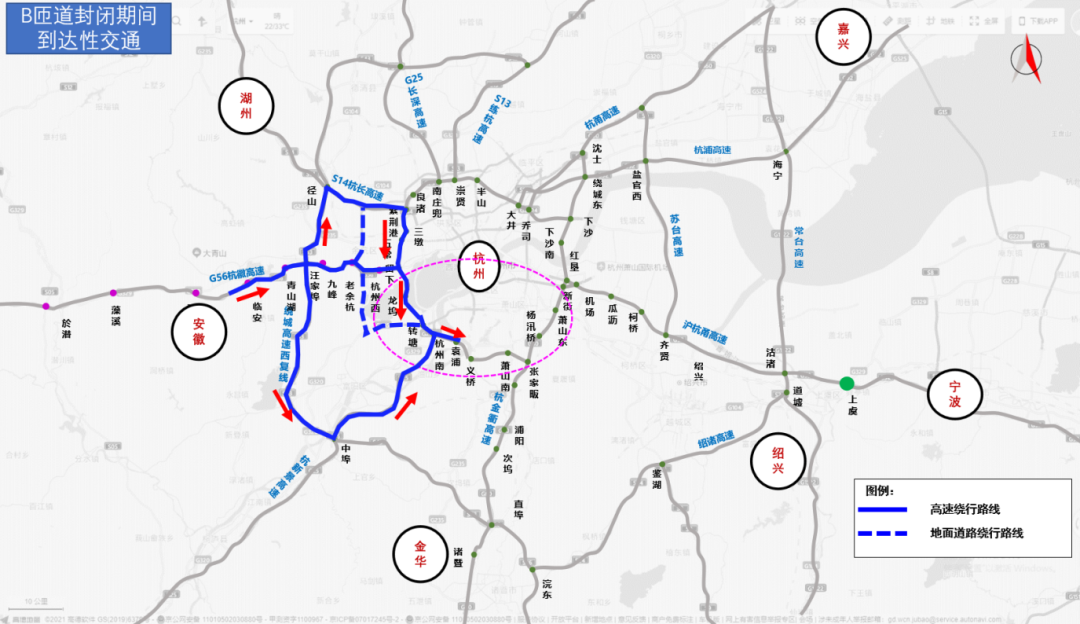 2021年12月21日—23日实施留下互通B匝道(西向南,临安往转塘方向)全封闭施工。
