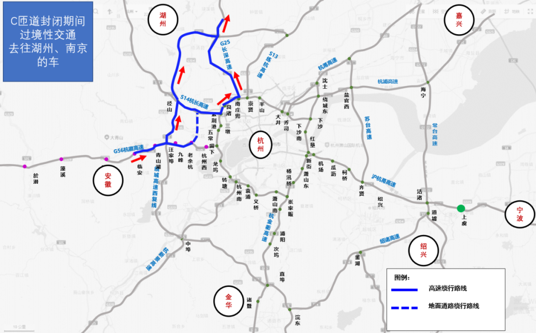 或由汪家埠枢纽—绕城西复线—径山枢纽—杭长高速—紫金港枢纽—绕城北线—南庄兜枢纽—杭宁高速通行。