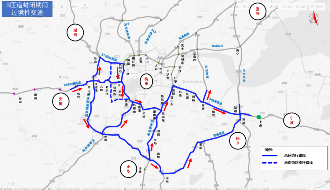 可由汪家埠枢纽—绕城西复线—径山枢纽—杭长高速—紫金港枢纽—绕城北线—大井枢纽—杭浦高速通行;