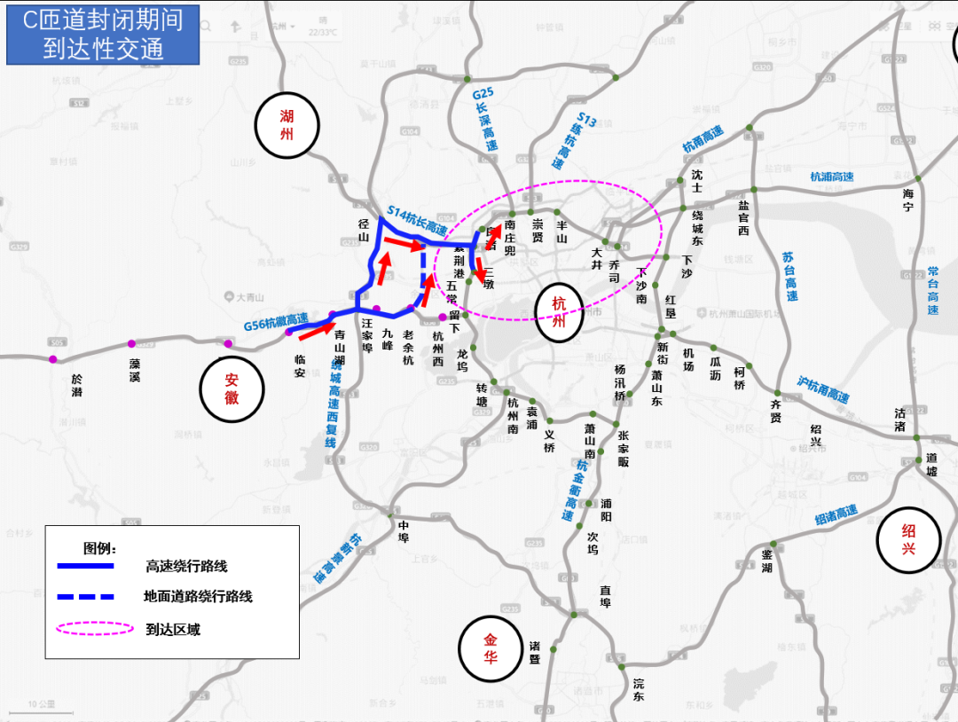 到达杭州龙坞、转塘附近、杭州萧山区的车辆,可由汪家埠枢纽—绕城西复线—径山枢纽—杭长高速—紫金港枢纽—绕城西线,根据目的地择优到达;