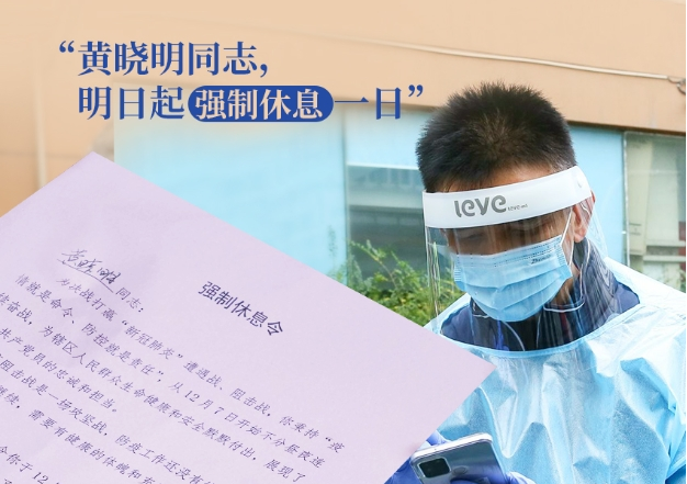 “12月16日中午,街道党工委副书记周邱忆将一纸‘强制休息令’,塞到了一线战疫人员黄晓明的手中,命令他必须休息一天。”