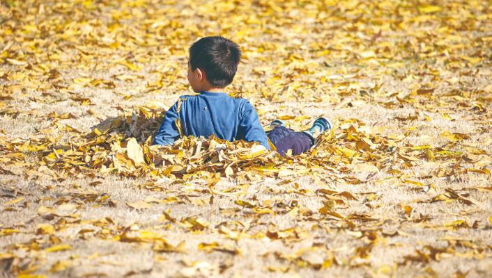 孤山草坪,孩子们在玩落叶。 记者 夏阳 摄