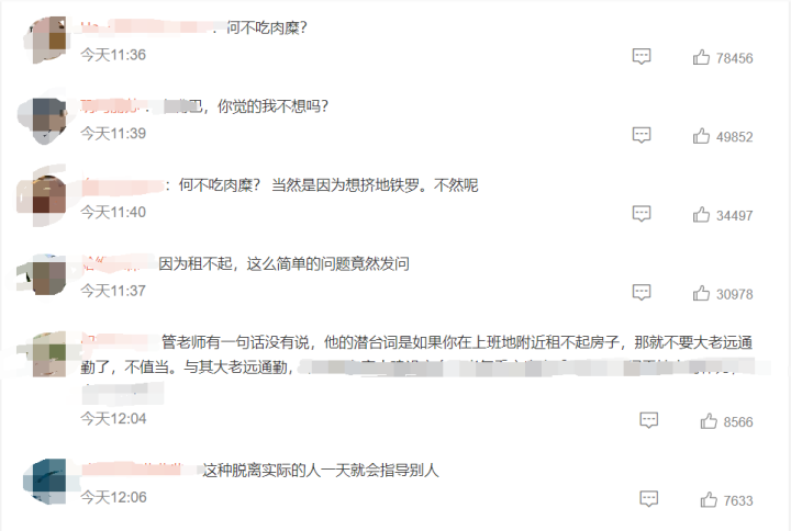 对此,网友们吵翻了,有网友表示,“何不吃肉糜?”,还有网友称,“因为租不起,这么简单的问题竟然发问”。