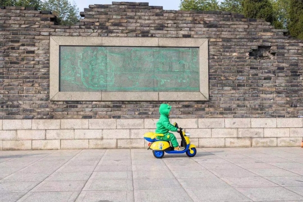 小朋友今早在太庙广场上“开车”。橙柿互动记者 夏阳 摄