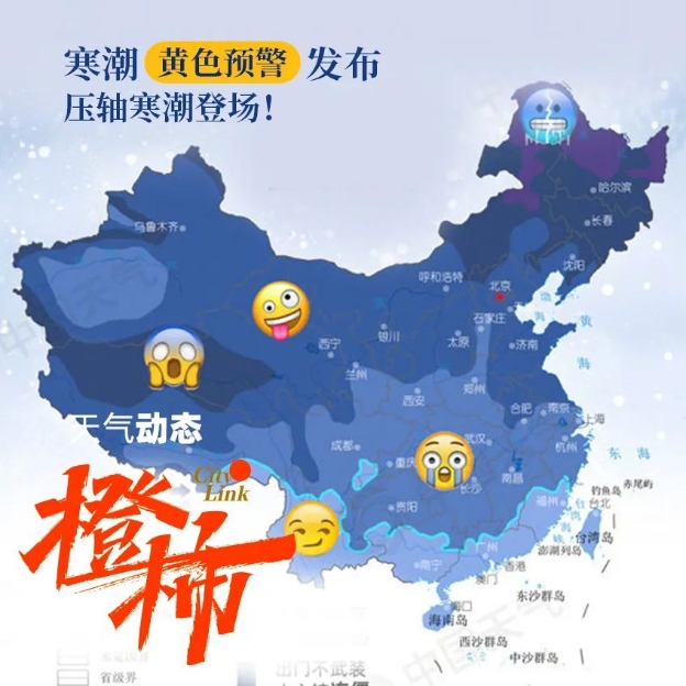 预计,12月24日08时至26日08时,江南及其以北大部地区先后有4~5级风,阵风6~8级;气温下降6~10℃,其中,山东南部、安徽东南部、贵州东部、湖南中西部等地的部分地区降温12℃以上。