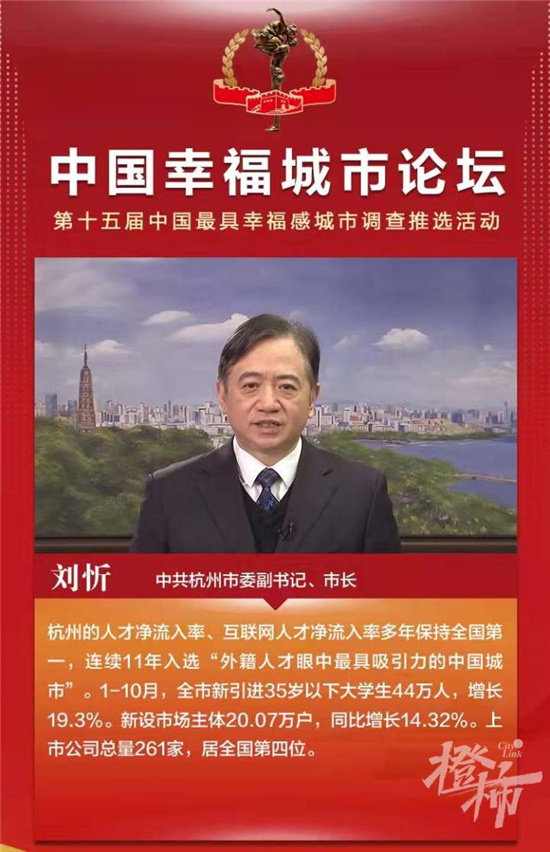 杭州致力打造创新活力之城。幸福城市应该是人才成就梦想、企业铸就辉煌的创新创业创造之城,我们坚持五湖四海广纳贤才,连续出台人才新政27条、人才生态30几条等系列政策,深化实施名校名院名所工程,推动西湖大学、之江实验室、中法航空大学等科创重企落地,为人才创新创业创造提供了广阔舞台。人才净流入率、互联网人才净流入率多年保持全国第一,连续十一年入选外籍人才眼中最具吸引力的中国城市。1到10月,全市新引进35岁以下大学生44万人,增长19.3%;新设市场主体20.07万户,同比增长14.32;上市公司总量达到261家,居全国第四位。