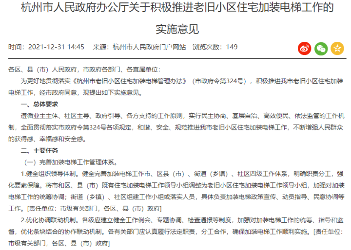 都市快报讯 2021年1月,杭州出台全国首个加装电梯政府规章《杭州市老旧小区住宅加装电梯管理办法》。为进一步完善相关配套政策,杭州发布了《杭州市人民政府办公厅关于积极推进老旧小区住宅加装电梯工作的实施意见》(以下简称《实施意见》),自2022年1月28日起正式施行。