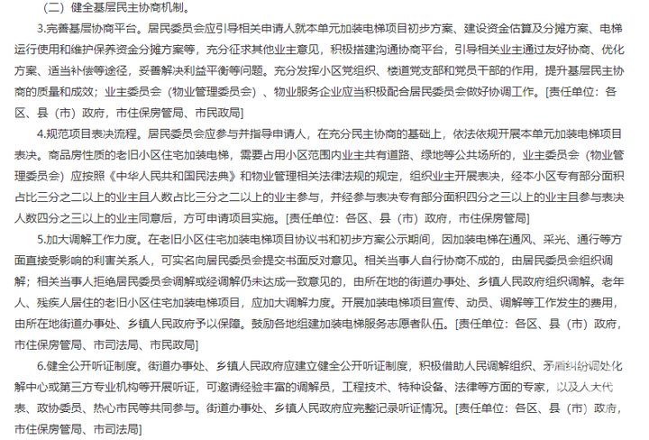 《实施意见》共分为总体要求、主要任务、保障措施三大部分。重点围绕完善加装电梯工作管理体系、健全基层民主协商机制、持续优化项目审批服务、综合提升项目实施质效、强化项目质量安全监管、建立健全长效管理机制、加大配套支持与保障力度七个方面提出20条主要任务。