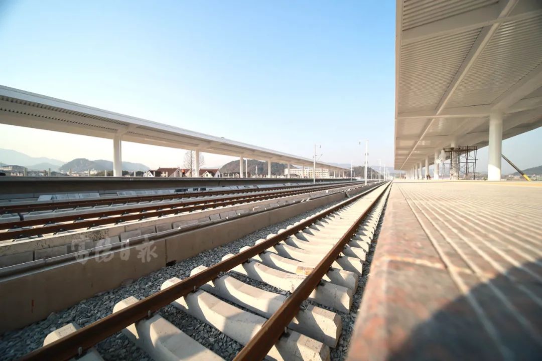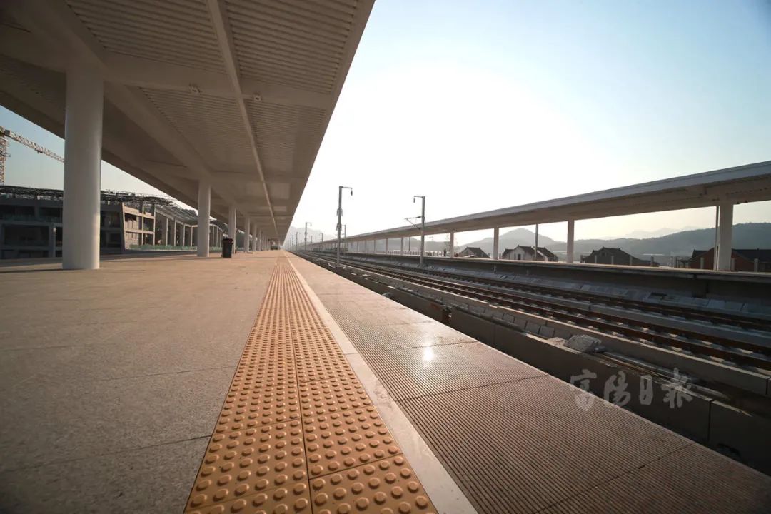 12月30日下午,记者在湖杭高铁富阳西站看到,站台两侧已经铺完钢轨的轨道线从西站一直向两边延伸,除了轨道上依旧还留有部分材料包裹,看上去和通车状态差不多。旁边的站台上,地砖和棚顶都已经基本完工,几位工人正在天花板处涂白色油漆。