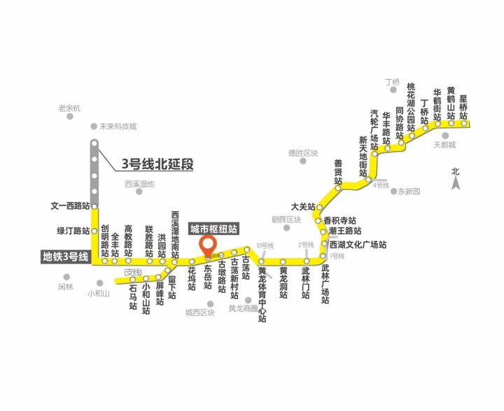 杭州地铁3号线一期(主线:文一西路站-星桥站;支线:石马站-西溪湿地南站),贯穿杭州东西,串联起杭州火车西站、小和山高教园、西溪湿地、杭州汽车西站、武林广场、西湖文化广场、大关社区、城北区块、半山、丁桥、天都城、星桥。
