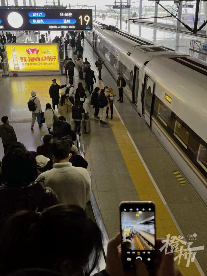 今天(1月8日)下午,我们和很多想要第一时间打卡这条新高铁的市民一起从杭州东站上车,坐上了经杭台高铁运行,开往台州方向的G9317次列车,这是杭台高铁上,由杭州开往台州方向的第一班对外售票的列车。