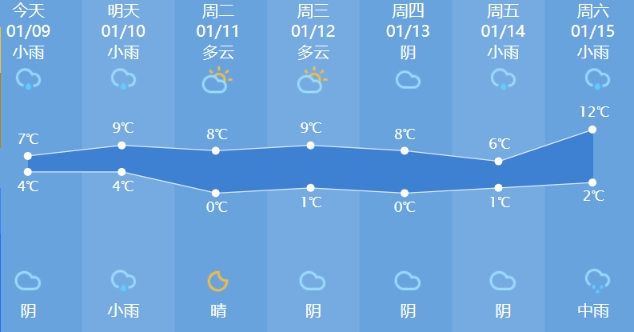 而杭州方面,预计今天上午、明天夜里有弱降水过程,14日、15日有较明显降水;10日夜里到11日受弱冷空气影响,有一次弱雨(雪)天气,气温有所下降,日平均气温过程降温幅度4~6℃。