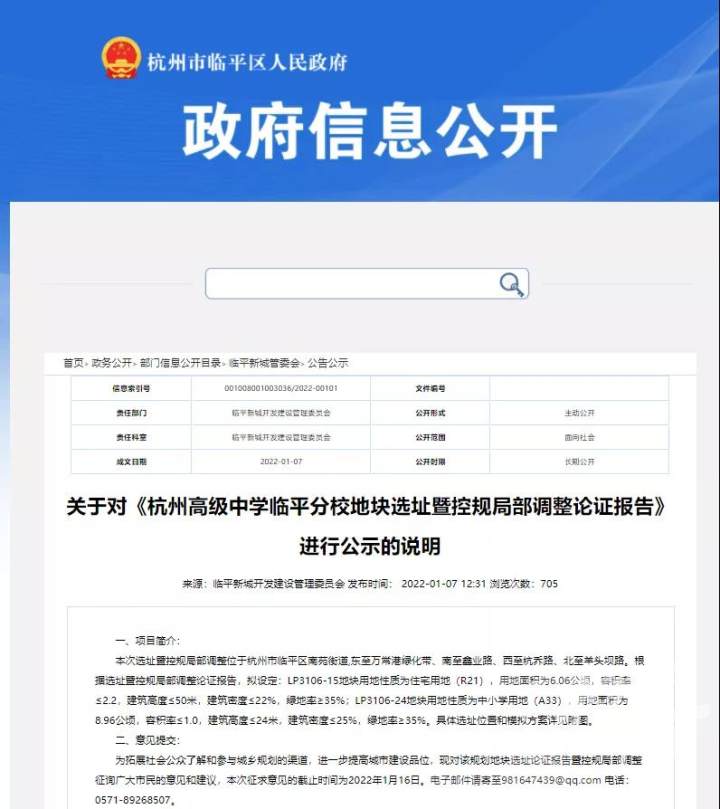 这是临平区政府网近日发布的一则信息,对《杭州高级中学临平分校地块选址暨控规局部调整论证报告》的公示说明。