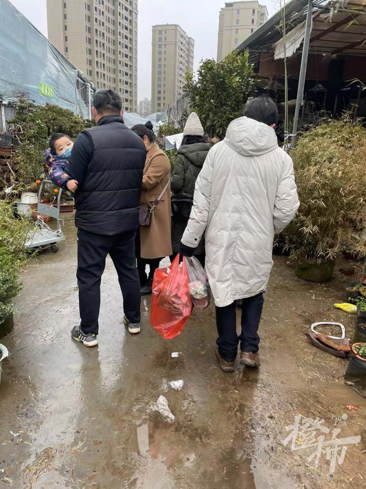 在市场里,我们正遇到一对夫妻看上了一盆红梅,直接把价格从90元“砍”到了60元。兴许是老板看红梅只剩最后一盆了,也有清货的想法。
