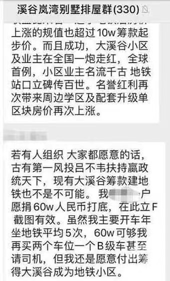 根据网络上流传的微信群截图,这个提议众筹建地铁的小区,就是位于杭州良渚的溪谷岚湾,其中一位居民在微信群中提出,愿意捐60万人民币“打底”,为使小区成为“地铁小区”献出一份力。