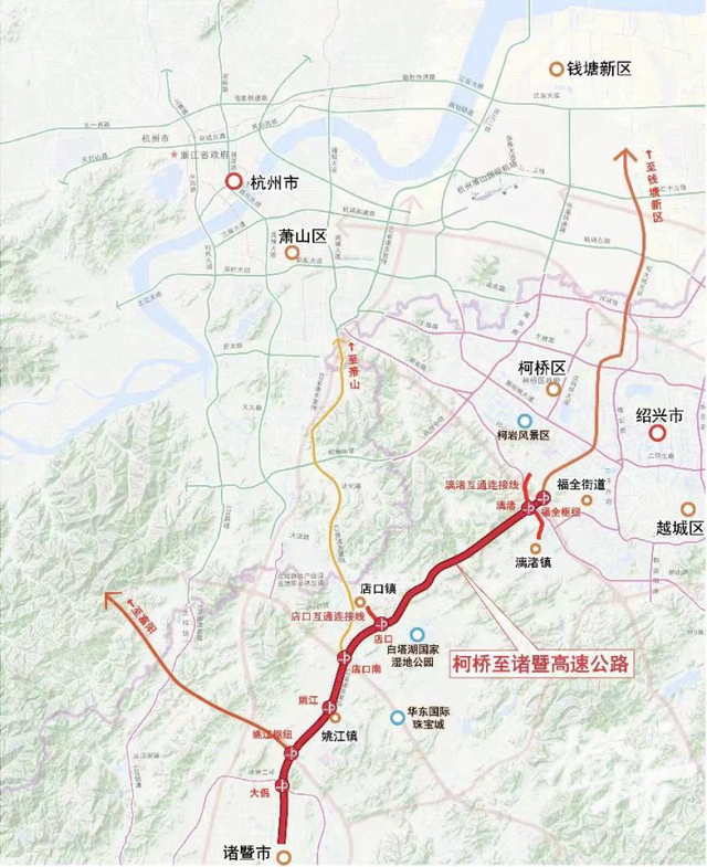 杭绍台高速公路除了能与杭甬、台金和甬金等高速公路相交,未来还将与连接柯桥与诸暨的柯诸高速公路相连。