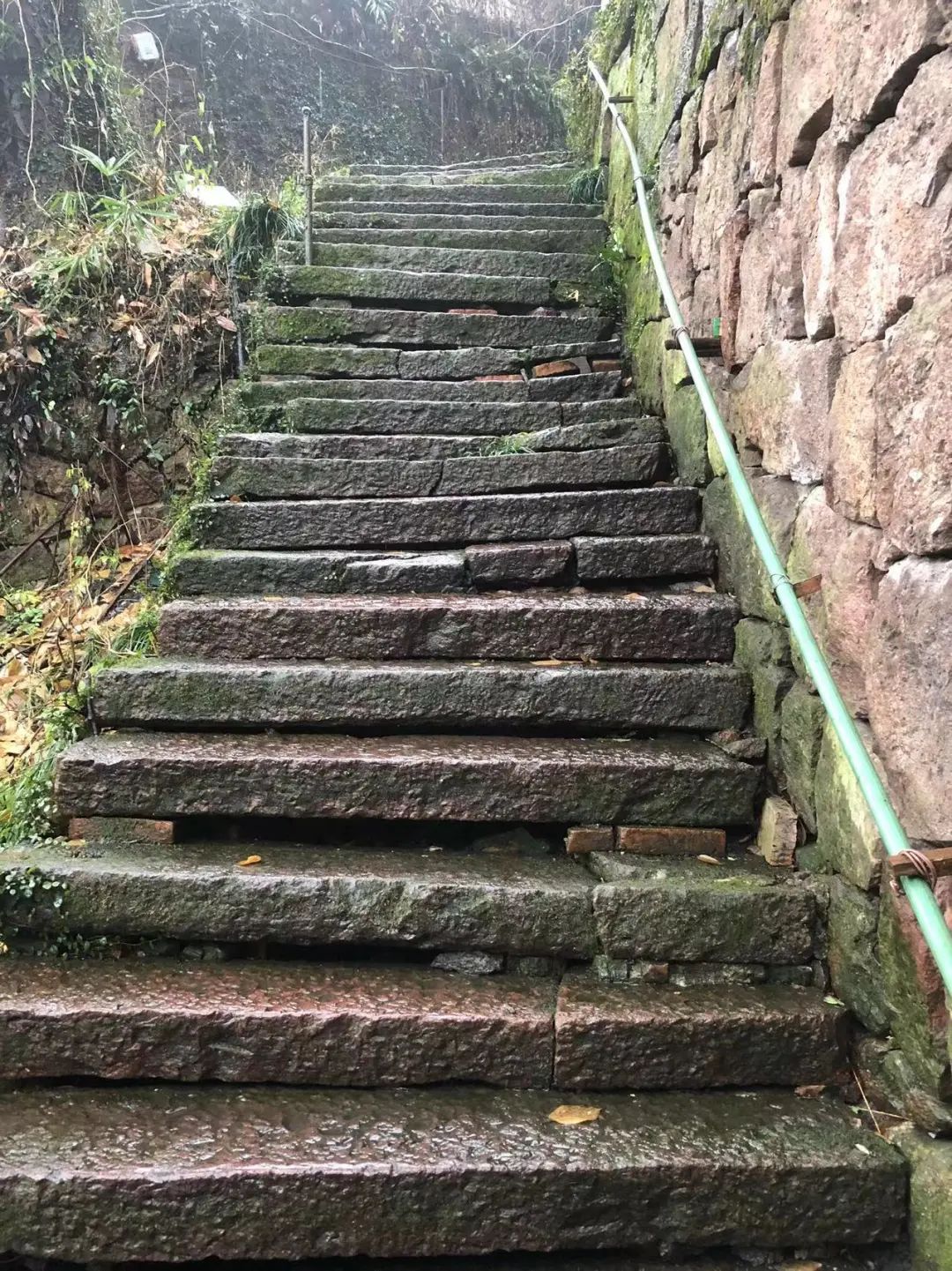 100多年过去,如今上行的石阶空有一根杆子,没有能抓扶的扶手。台阶也无人悉心照料,处处青苔,雨天特别容易打滑,行人途经这里必须格外小心。