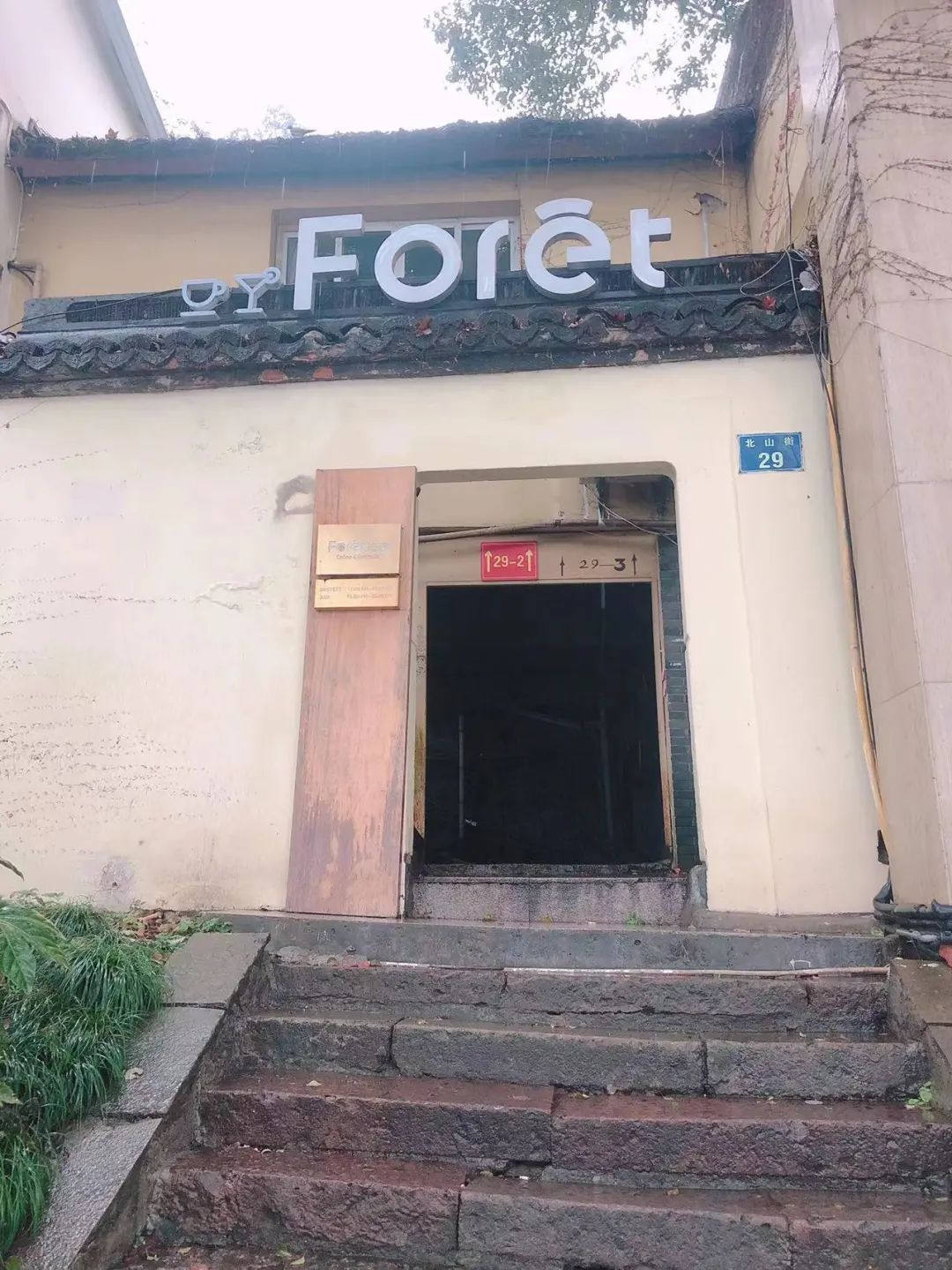 一个阴雨天,我们来到北山路29号,从标有咖啡馆名字的大门进入,经过一段昏暗的走廊,踏上一条上行的石阶路,这就进入坚匏别墅的范围了。