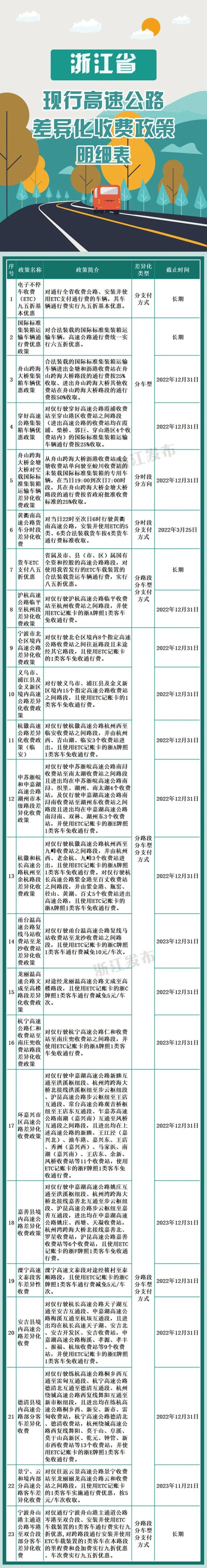 浙江发布消息 为进一步提升高速公路通行效率和服务水平,促进物流降本增效,省交通运输厅、省发展和改革委员会、省财政厅近日联合印发《浙江省全面推广高速公路差异化收费实施方案》,明确继续实施现有差异化收费政策,积极开拓差异化收费项目。具体内容,一起了解~