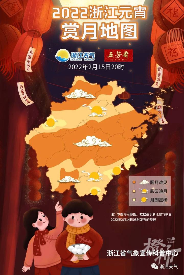 浙江全省多云,有时阴天。今天杭城的赏月指数不如预期,天空云量较多,有时能见到月亮,因而想要看到皓月当空的景象有点难,大家可以期待一下彩云追月的场景。预计杭城今天17~23时,气温4~7℃,出门赏月记得保暖。