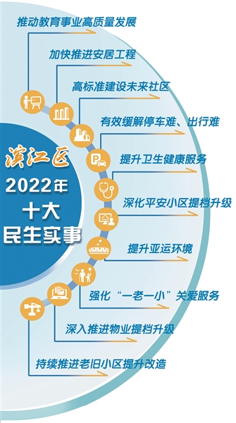 增进民生福祉,让老百姓更幸福,滨江还将在推动教育事业高质量发展、加快推进安居工程、高标准建设未来社区、提升健康卫生服务、强化“一老一小”关爱服务、提升亚运环境、深入推进物业提档升级以及持续推进老旧小区提升改造方面,为民办实事。