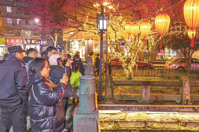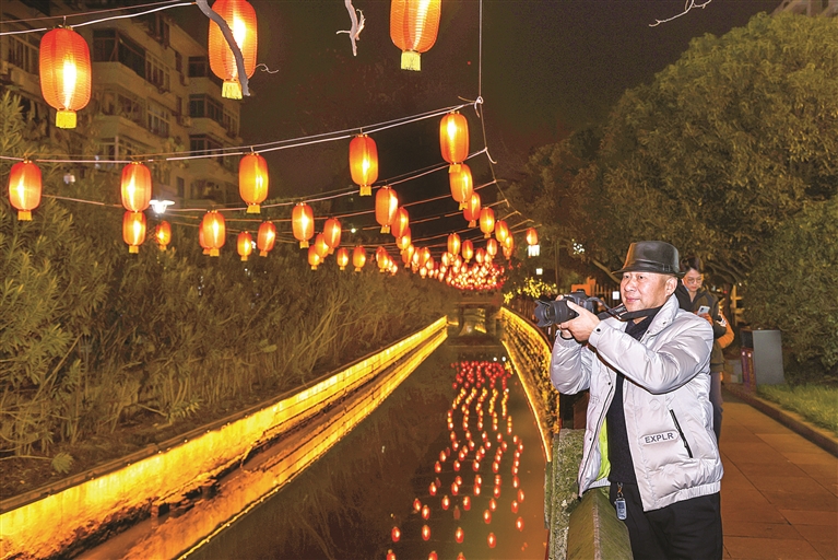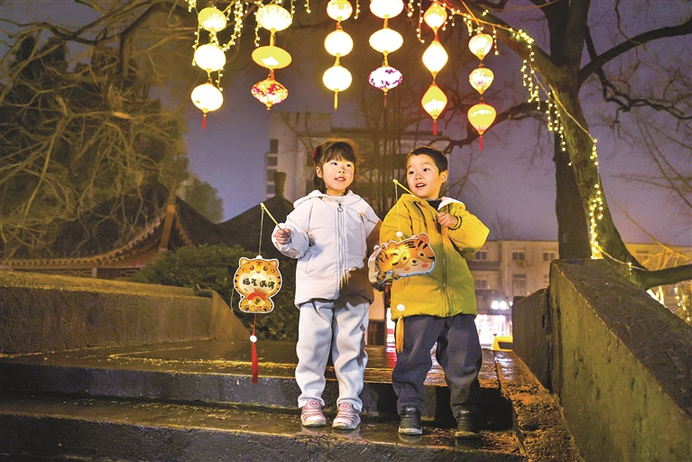 当天晚上,家住回澜南苑的张女士带着儿子、女儿出现在观灯的人流里。他们沿着城河,从回澜桥头一路走至市心桥头。两个孩子看着轮番变化的光影和花灯,不断发出惊叹:“地上有只可爱的老虎!”“看,桥上还印着一首诗呢。”“瞧,这树上的灯笼太好看了,以前只有在古装片里看到过!”因为景色很美,大家走走停停,用了1个多小时。但两个孩子兴致勃勃,一点也不觉得累。