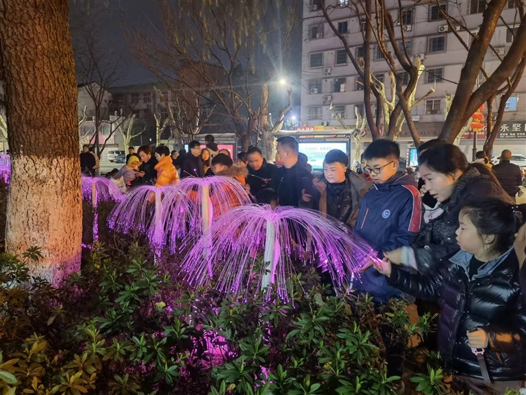 市心桥头设置了常规的新春祝贺及迎亚运主题灯光,萧然桥头设置了盛唐繁荣风貌的互动装置,梦笔园小径和梦笔桥头设置了“梦笔生花、步步为莲”地面投影互动步道,仓桥桥洞设置了蝴蝶动态灯光秀投影,回澜初中对面河岸上设置了一个以亚运元素、校园青春朝气为主的许愿池……每走几步,都值得停下来细品、拍照。