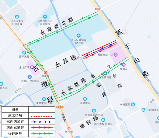 一、调整措施自2022年2月22日起至2022年4月30日,金昌路(莫干山路—朱家路)段部分车道封闭施工。施工期间,金昌路(莫干山路—朱家路)段调整为4条机动车道、2条非机动车道通行,限速同步调整为40公里/小时。