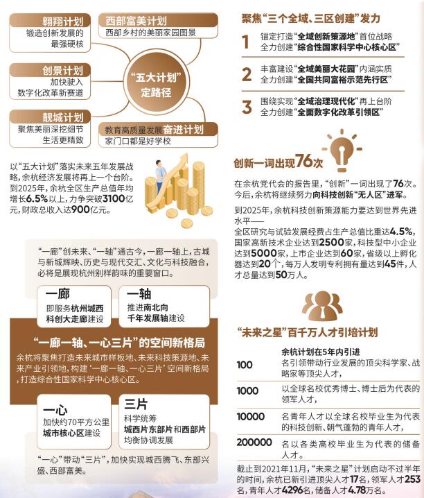 这里有之江实验室、湖畔实验室、良渚实验室、浙大超重力实验室、中法航空大学……,这里有5000多年良渚文化、2000多年运河文化、1000多年径山文化……区划优化调整后的余杭区,一如既往地保持着高质量发展的蓬勃动力,多项经济社会指标居于全省前列。奋进新时代、建设新天堂!余杭定下目标:打造面向世界、引领未来、服务全国、辐射全省的未来城市样板地、未来科技策源地、未来产业引领地,打响创新余杭、品质之区、文明圣地的城市品牌。如何贯彻落实市第十三次党代会精神?如何继续保持当红不让的发展势头?如何奋力争当展示“重要窗口”和共同富裕示范区的排头兵?近日,我们采访了杭州市委常委、余杭区委书记刘颖,展望余杭区的未来五年。