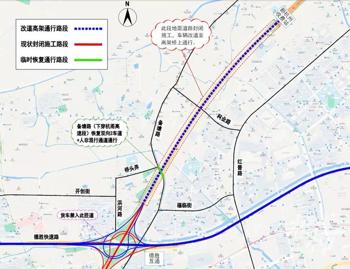 高架开通后将极大地改善通行条件,提升通行能力,方便市民通过杭州收费站进出杭州城,市民驾车从沪杭甬高速杭州收费站驶出后,可以一路走宽阔的新高架路,到达德胜互通,再驶入德胜快速路,通向杭州市区的其他区域。