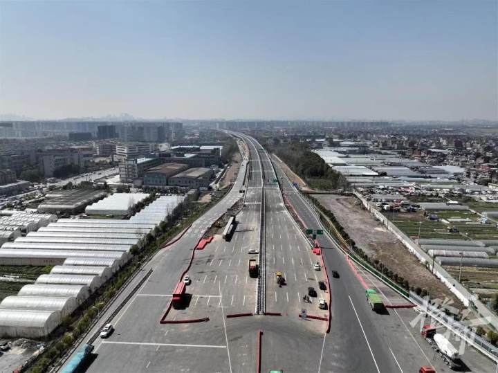 过了新彭埠大桥,到了钱江南岸,就是机场轨道快线合建段。这一段上层是快速路,中间层是机场轨道快线,下层是地面城市道路,是集城市快速路、轨道快线、慢行系统为一体的“一廊多线”综合立体交通大走廊,同样预计6月底前具备通车条件。
