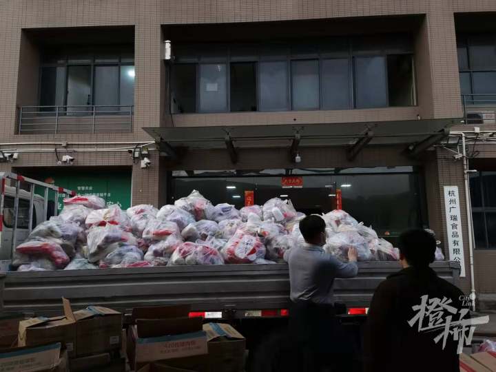 早上8点,杭州广瑞食品公司的大门口,一辆装满蔬菜、水果等生活物资的大卡车正准备发车。