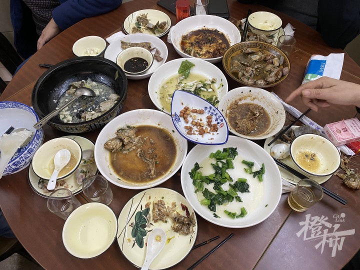 肉饼蒸鲞、糖醋里脊、黑鱼两吃、雪菜墨鱼丝……点了11个菜1个汤,全部吃光了,三个会喝酒的还搞了两瓶会稽山方瓶。