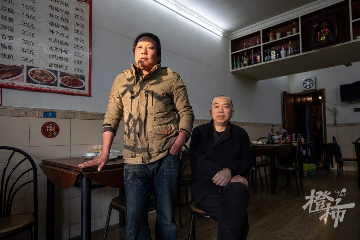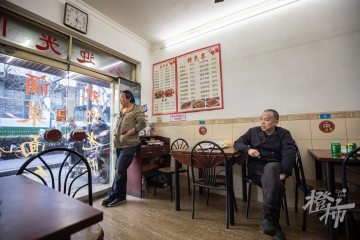 天厨酒家,汪建国(右)和沈伟明在店里等待客人。