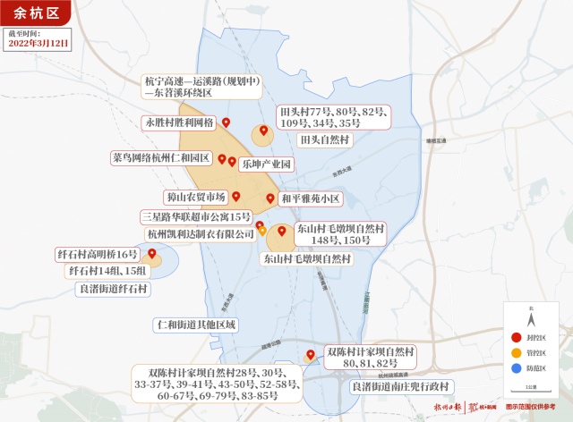 管控区:新增划定仁和街道田头自然村,杭州凯利达制衣有限公司,仁和街道双陈村计家坝自然村28号、30号、33-37号、39-41号、43-50号、52-58号、60-67号、69-79号、83-85号,良渚街道纤石村14组、15组,以及14组周边的13组的12户居民楼的合围范围;