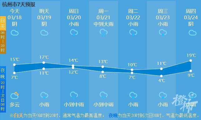 预计未来七天(18-24日)杭州天气晴雨相间,降雨将出现在明天(19日)夜里到22日,其中周日(20日)夜里到下周一有中到大雨局部暴雨;气温也将由前期的明显偏高,回落至接近常年或略偏低,20-24日气温较低,22日最高气温10℃左右,23-24日最低气温5℃左右,这样的气温真有点冷回冬天的意思。