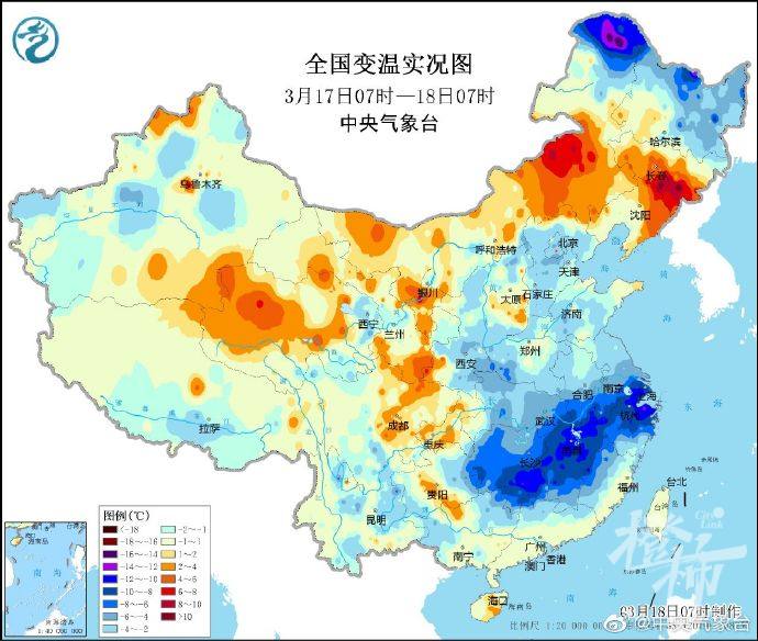 但是前期的温度升得有多高,冷空气一来,就会降得有多猛。今天早上,江苏南部、安徽南部、湖北东部、上海、浙江中北部、福建西部、江西、湖南等地出现6~10℃降温,局地降幅超过12℃。今晨06时,我省北部地区24小时降温10℃左右,一举扭转前期的偏暖格局。