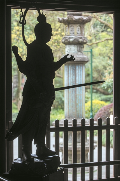 最后,苏东坡凛然告诉僧人们:“这件事由我而起,上天若降灾祸,就冲着我来,但筑堤之事绝不能耽误。我愿意雕刻自身石像,为高丽寺护法。”于是,慧因高丽寺的伽蓝殿里便有了这尊 “护法”石像。