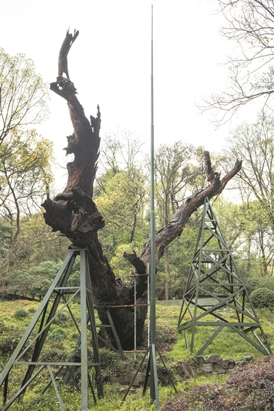 用钢架支撑的法相唐樟,中间高耸的是避雷针。