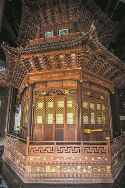 从外面看,轮藏殿不大,一进门,一座木塔(轮藏)充满整个殿堂,一轮一轮往上升,有13.5米高,仰头细看,材料全是楠木,通体镌雕天龙飞天护持佛经和佛法。轮藏最初的功能是收藏经书,相当于一个能转动的巨型书架。