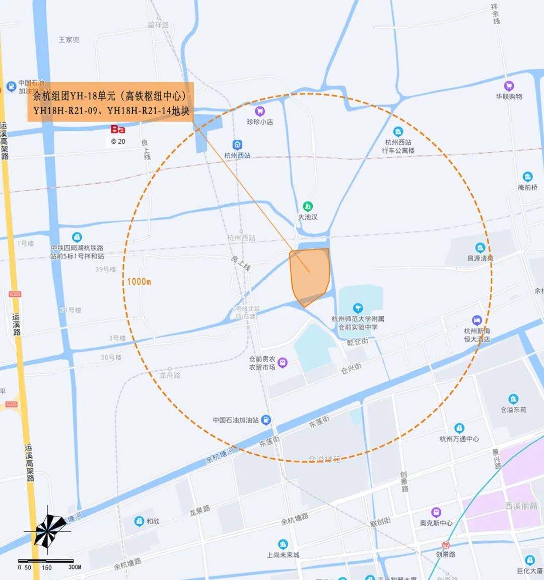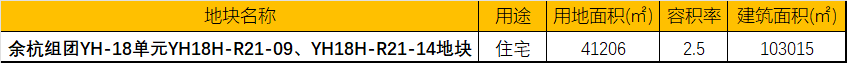 该地块位于余杭区仓前街道,杭州市余杭组团YH-18单元(高铁枢纽中心)内,东至良亭港路西侧绿地,西至杭韵东路,南至庵前桥港北侧绿地,北至众成街,出让土地面积约41206平方米,容积率2.5,地上建筑面积约103015平方米。