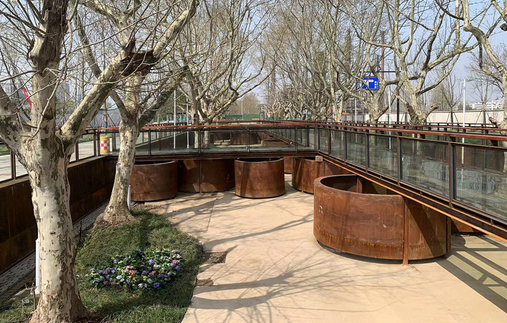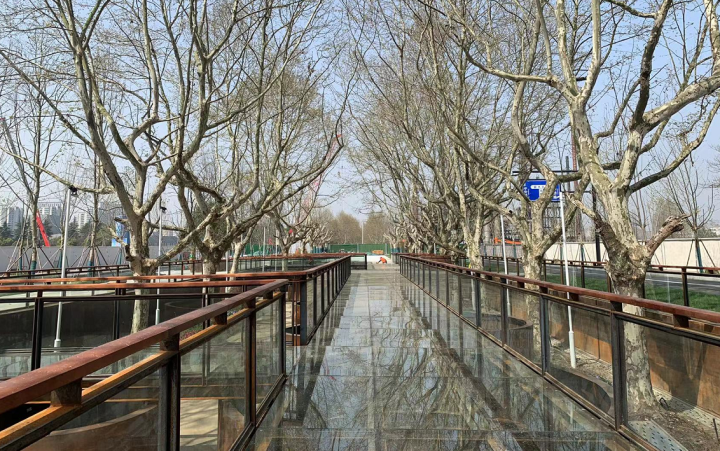 因路面抬升,原炼油厂路面比玻璃栈道矮1米多,成为下沉式广场。这也意味着人站在玻璃栈道上,距离老梧桐树宽大的树冠更近了,春来嫩芽满枝,秋去黄叶满天,都将会是绝佳的拍照打卡地。